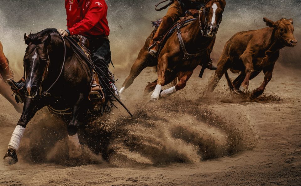 one of the most thrilling competitions in cow horse and cutting. The composition emphasizes speed,